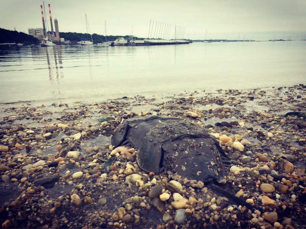 It’s that time of the year again on Long Island, Atlantic horseshoe crabs (Limulus Polyphemus) travel from the depths of the ocean to cruise our beaches in search of romantic rendezvous. Female horseshoe crabs carry thousands of eggs to deposit in the sand at the upper edges of the high tide line. Males follow, jostling each other for position behind a female. The successful male will fertilize the eggs after the female deposits her eggs in a shallow nest. They will remain together depositing and fertilizing eggs while the tide recedes. On the next high tide the female will pull the male back out to deeper water. She may repeat these rendezvous 4 or 5 times during the spawning season with potentially new males competing each time.