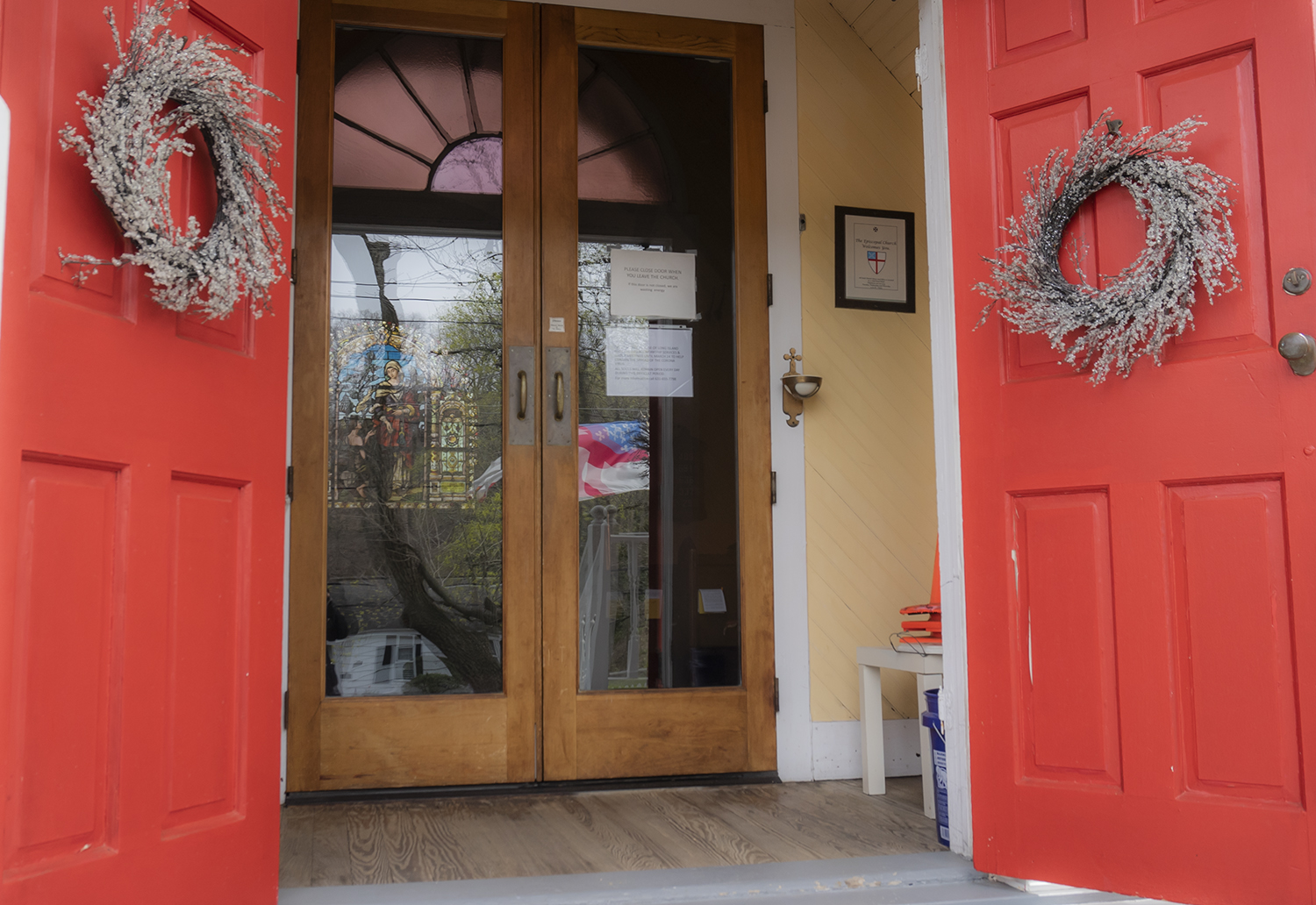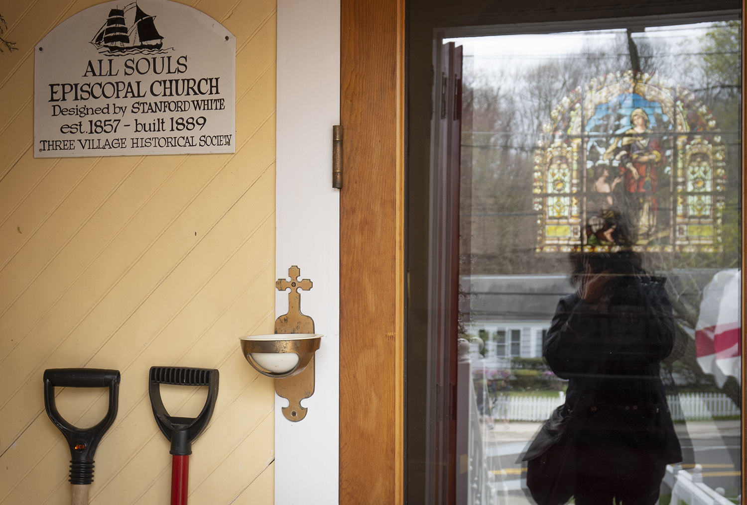In the 1980’s I worked at the New-York Historical Society as a research assistant in the department that housed a large collection of McKim, Mead and White’s architectural drawings and documents. I have visited many of the buildings they designed but at the time I could not foresee that decades later I would live in this community, near this sweet building created for community gathering and spiritual reflection. The window behind the alter, visible in the photo with my reflection, represents the ideal of Caritas (Charity), a wealthy woman giving a coin to a beggar. The Episcopal Church is currently inviting all to join in cultivating a “Habit of Grace.”